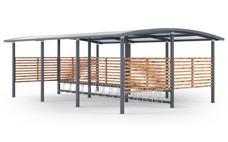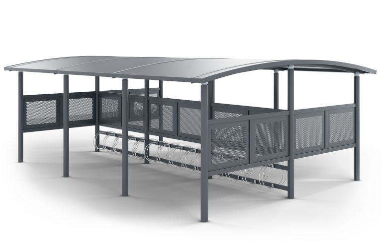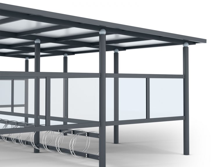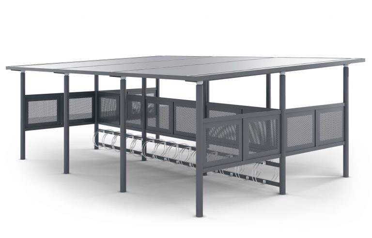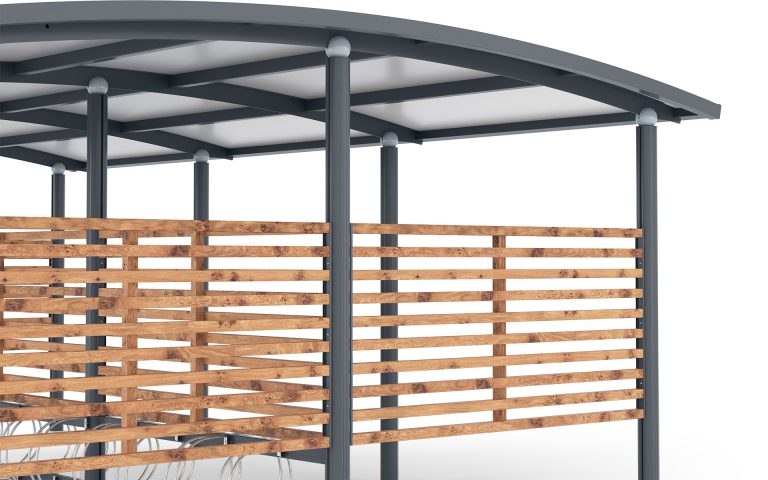 Ymer Dubbel tillverkas i moduler och kan erbjudas i en mängd olika varianter. För att ge minimalt underhåll använder vi pulverlackerade aluminiumprofiler genomgående. Väggsektionerna kan fås i perforerad aluminium, härdat 8 mm glas eller träpanel. Ymer monteras som standard på betongplintar.