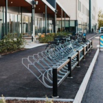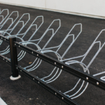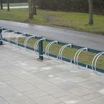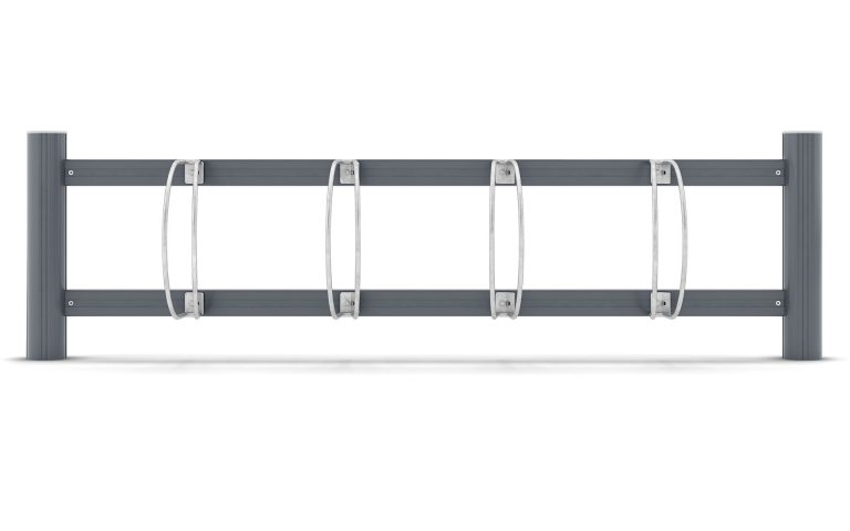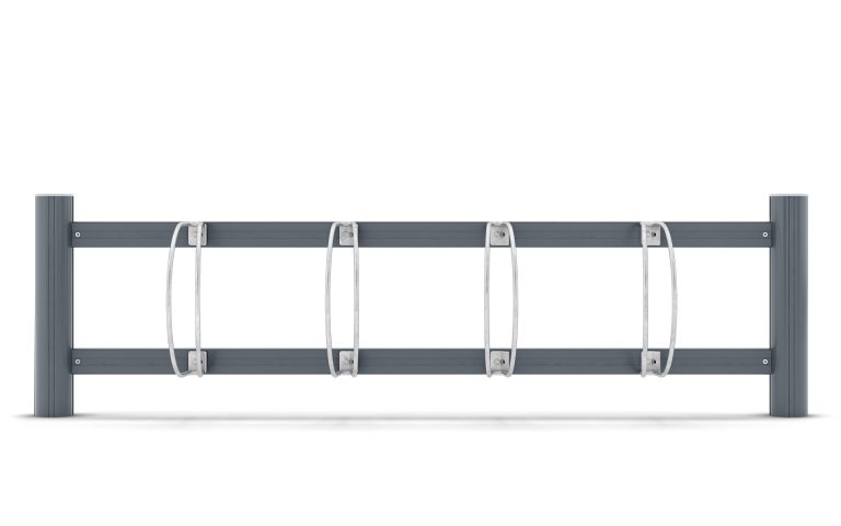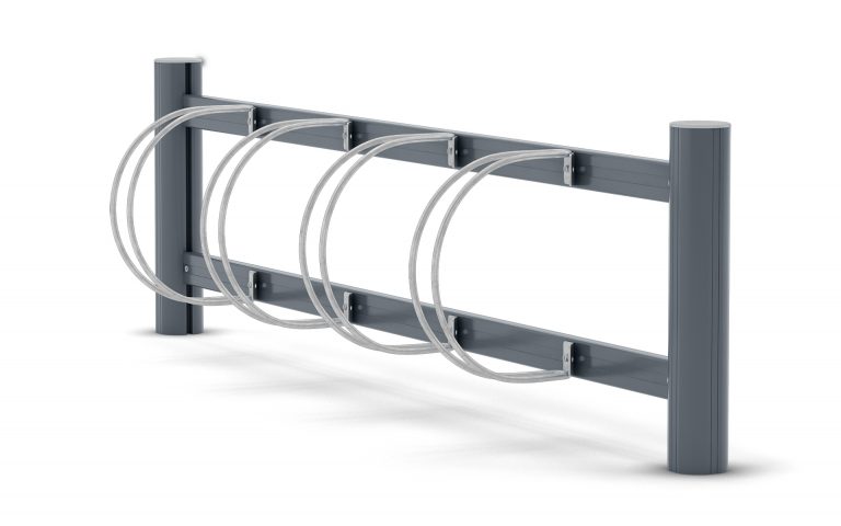 Ett stabilt och tåligt cykelställ med stativ av pulverlackerad aluminium och hjulhållare av varmförzinkat stål. Välj mellan svarta plastlock eller kulor av massiv aluminium som avslutning på stolparna.