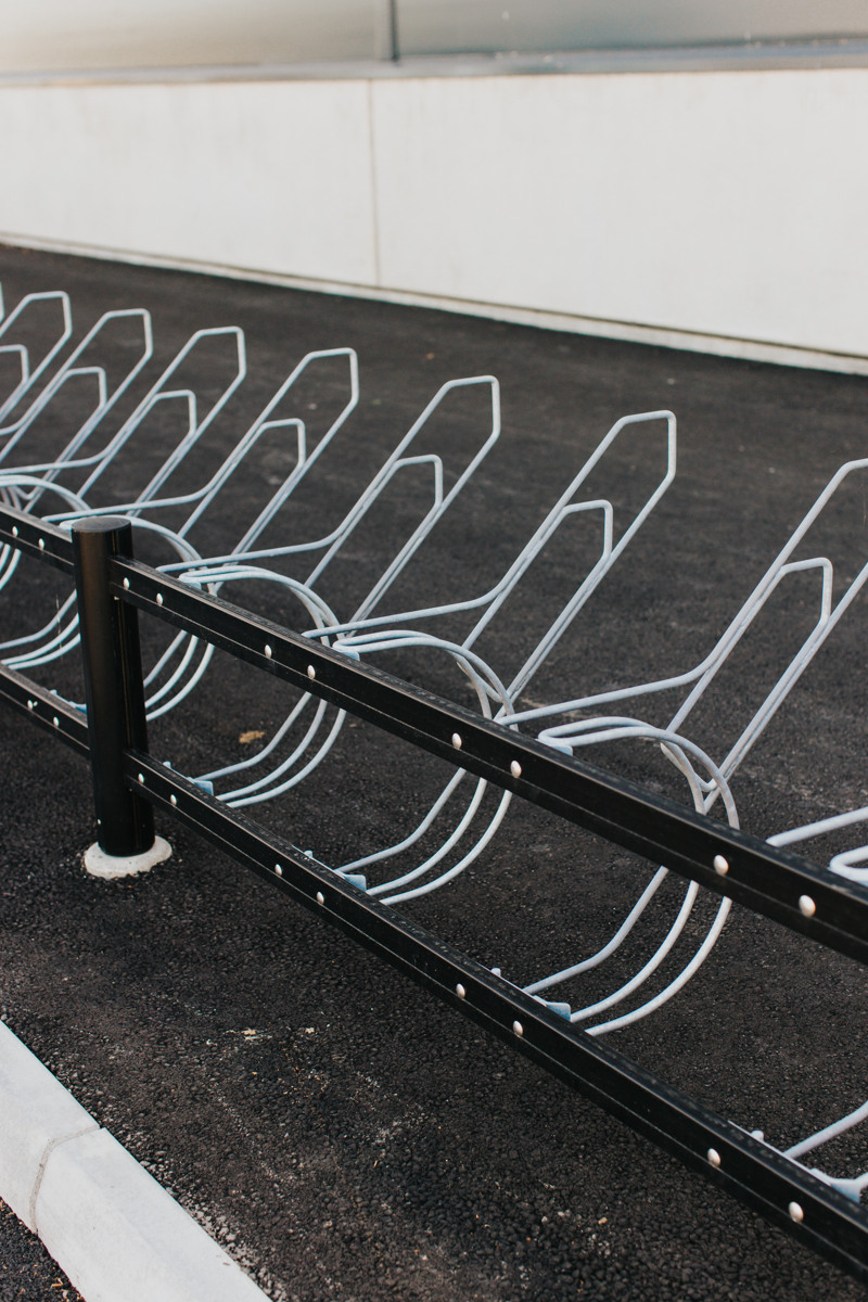 Ett stabilt och tåligt cykelställ med stativ av pulverlackerad aluminium och hjulhållare av varmförzinkat stål. Välj mellan svarta plastlock eller kulor av massiv aluminium som avslutning på stolparna.