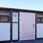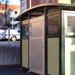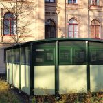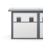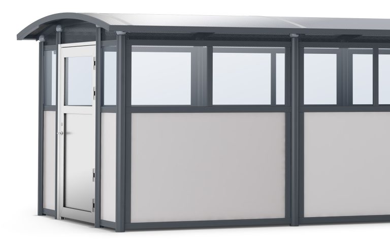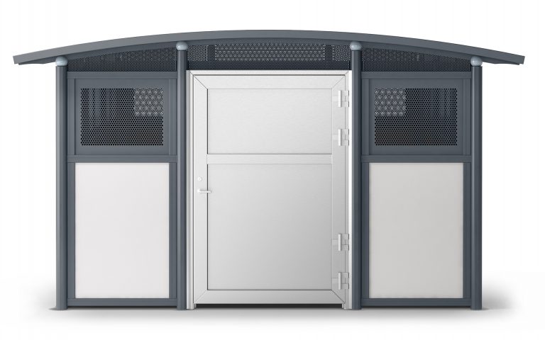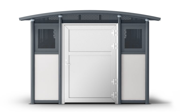 - Väggmaterial av pulverlackerad perforerad aluminiumplåt, utomhuslaminat Formica Vivix eller härdat glas.