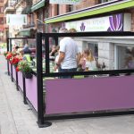 Rama in uteserveringen med ett staket som har vindskyddad utsikt genom att komplettera restaurangstaket markisväv som med en färdigmonterad överdel av 6 mm polykarbonatplast.